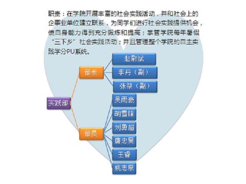 在公司开展丰富的社会实践活动,并和社会上的企事业单位建立联系,为同学们进行社会实践提供机会,使自身能力得到充分锻炼和提高;掌管公司每年暑期“三下乡”社会实践活动;并且管理整个公司的自主实践学分PU系统。