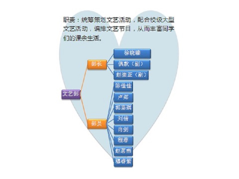 统筹策划文艺活动,配合校级大型文艺活动,编排文艺节目,从而丰富同学们的课余生活。