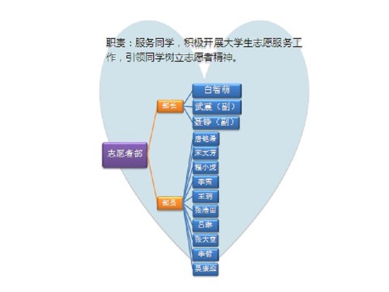 组织院内热心于志愿公益、无偿贡献自己力量的一群人,为公司发展和社会和谐提供志愿服务,宣传各类志愿活动,组织策划与统筹各项公益服务活动,通过在校内外举办志愿服务活动,从而提高在校老员工综合素质,也为发扬无私奉献的志愿者精神贡献力量。同时负责运营管理公司公益组织读书吧,鼓励大家多读书,读好书,提高文学修养和人生品味。