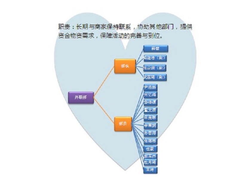 外联部职责是长期与商家保持联系,协助其他部门,提供资金物资所需,保障活动的完善与到位。