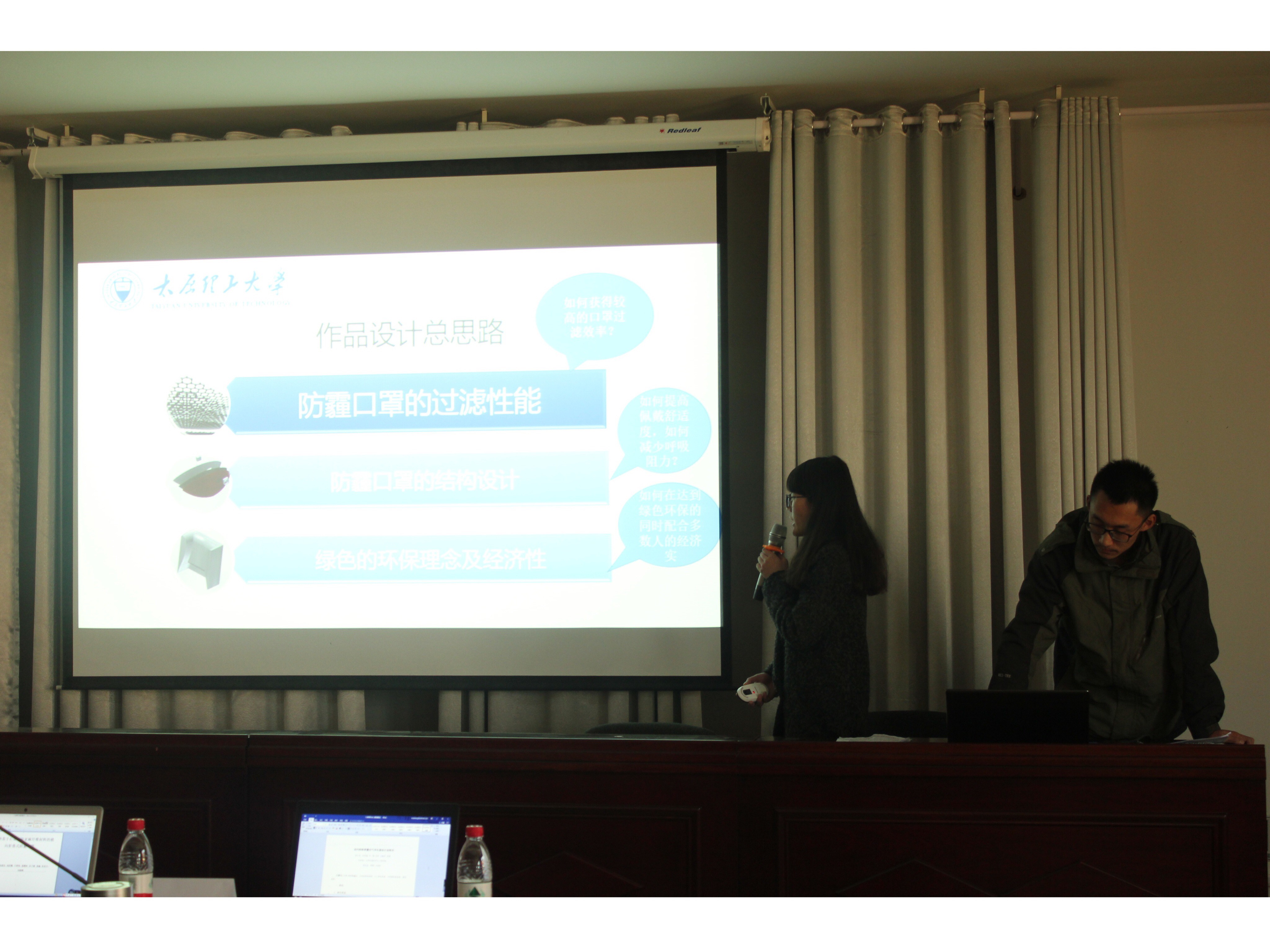 第三组设计了日常生活中常常用到的防霾口罩。选手从现状入手,目前市场上口罩质量参差不齐,缺点太多。选手从过滤性、整体结构改进,增加环保理念,提高经济实用性。