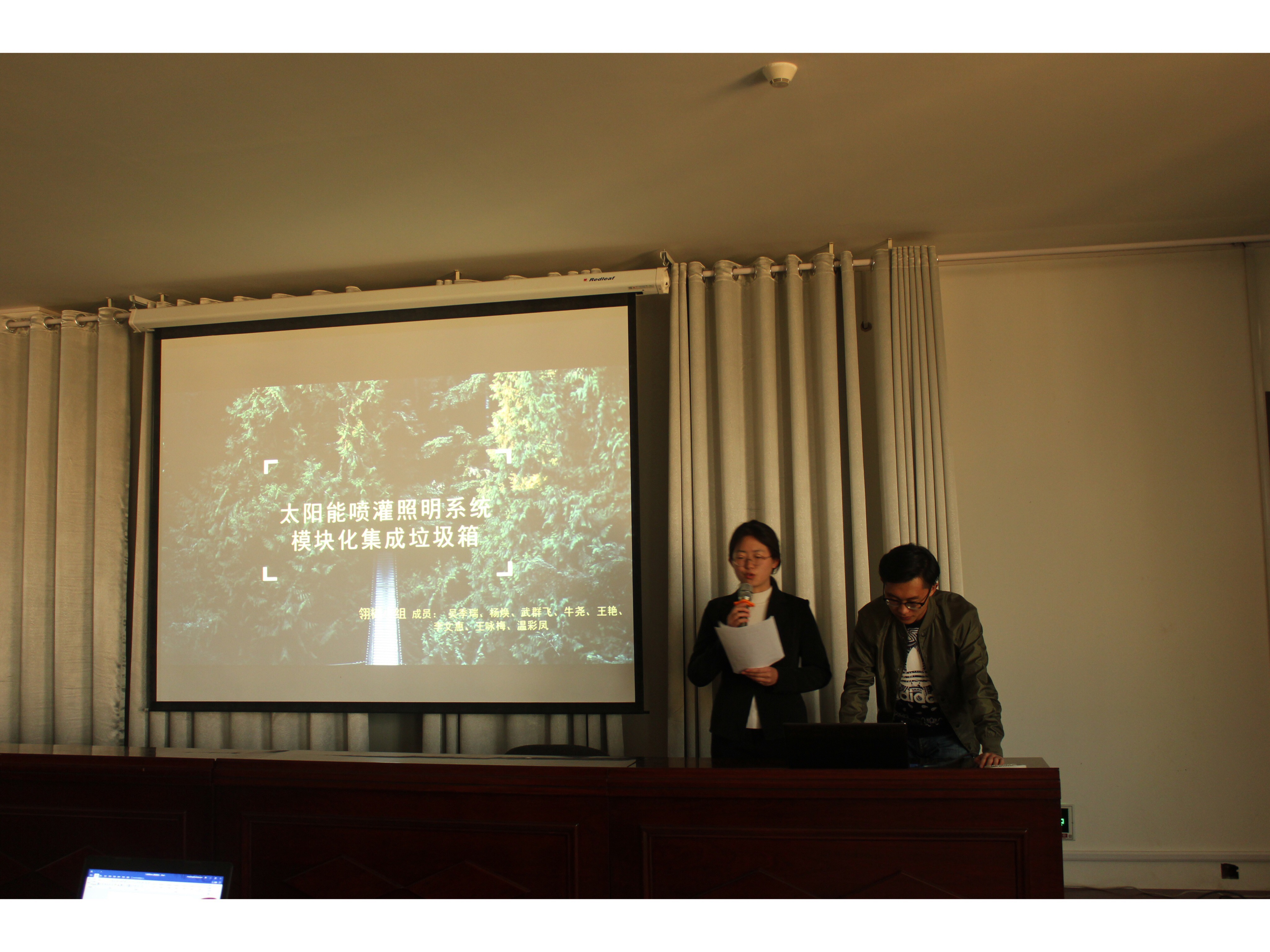 第十一组设计的是运用太阳能的集成垃圾箱,有照明、收集雨水等作用。选手设计给垃圾箱加入太阳能电池板、雨水收集浇灌系统,以达到雨天储水、晴天灌溉的目的。