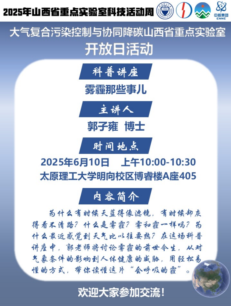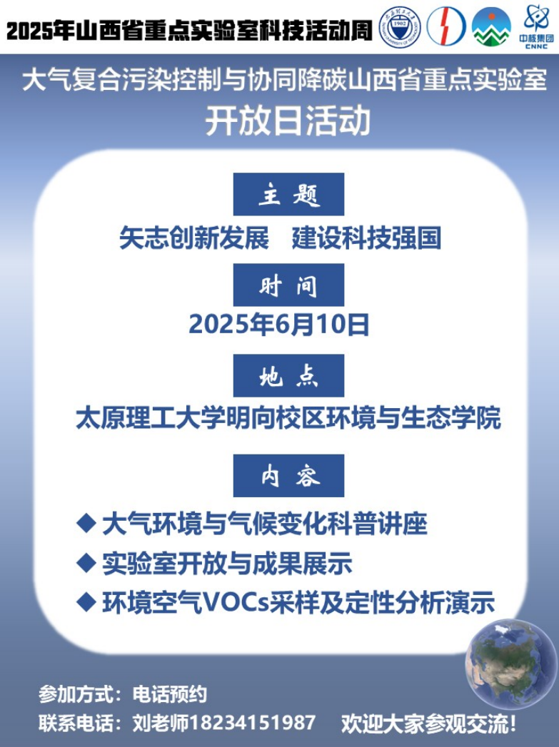 为贯彻落实山西省科技厅《关于举办2025年全国科技活动周和科技工作者日活动的通知》精神,弘扬科学家精神,普及科技知识,大气复合污染控制与协同降碳山西省重点实验室定于2025年6月10举办开放日活动。现将有关事项通知如下: