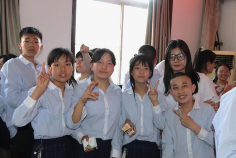 在分享会的尾声,有两位同学现场教学实践队员歌曲《感恩的心》的手语歌词,队员们在学习后也向同学们对学习效果进行了展示。之后,实践队员向同学们发放此前精心准备的明信片等小礼物,并鼓励特校同学彼此交换明信片。分享会结束后,晋中特校员工与实践队员热情合影。
