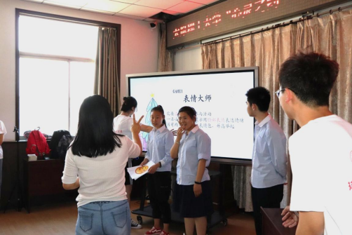 活动伊始,实践团队的队员们用自学的手语向孩子们问好,现场同学也积极地做出回应。随后,实践队队长朱婧向大家介绍此次宣讲会,将员工们的目光引向实践团队队员们设计的小剧场中,以正式开启此次分享会的主要内容。第一板块“情绪是什么”由环工2003班张亦琛主讲,旨在让同学们认识情绪,并接受自己会存在的各式各样的情绪。在第一部分的分享中,实践队员组织了“表情大师”、“情绪大师”两个小游戏,分别让同学们根据同伴的面部表情匹配表情包和根据肢体动作猜出与情绪有关的成语。同学们在游戏过程中表现积极,分享会现场的气氛非常热烈,经过这两个小游戏也迅速拉近了特校员工与实践队员们的距离。分享会的第二、第三板块分别由级李政昆和冯兰茜主讲,在这两部分也设置了串场的小剧场和互动游戏。