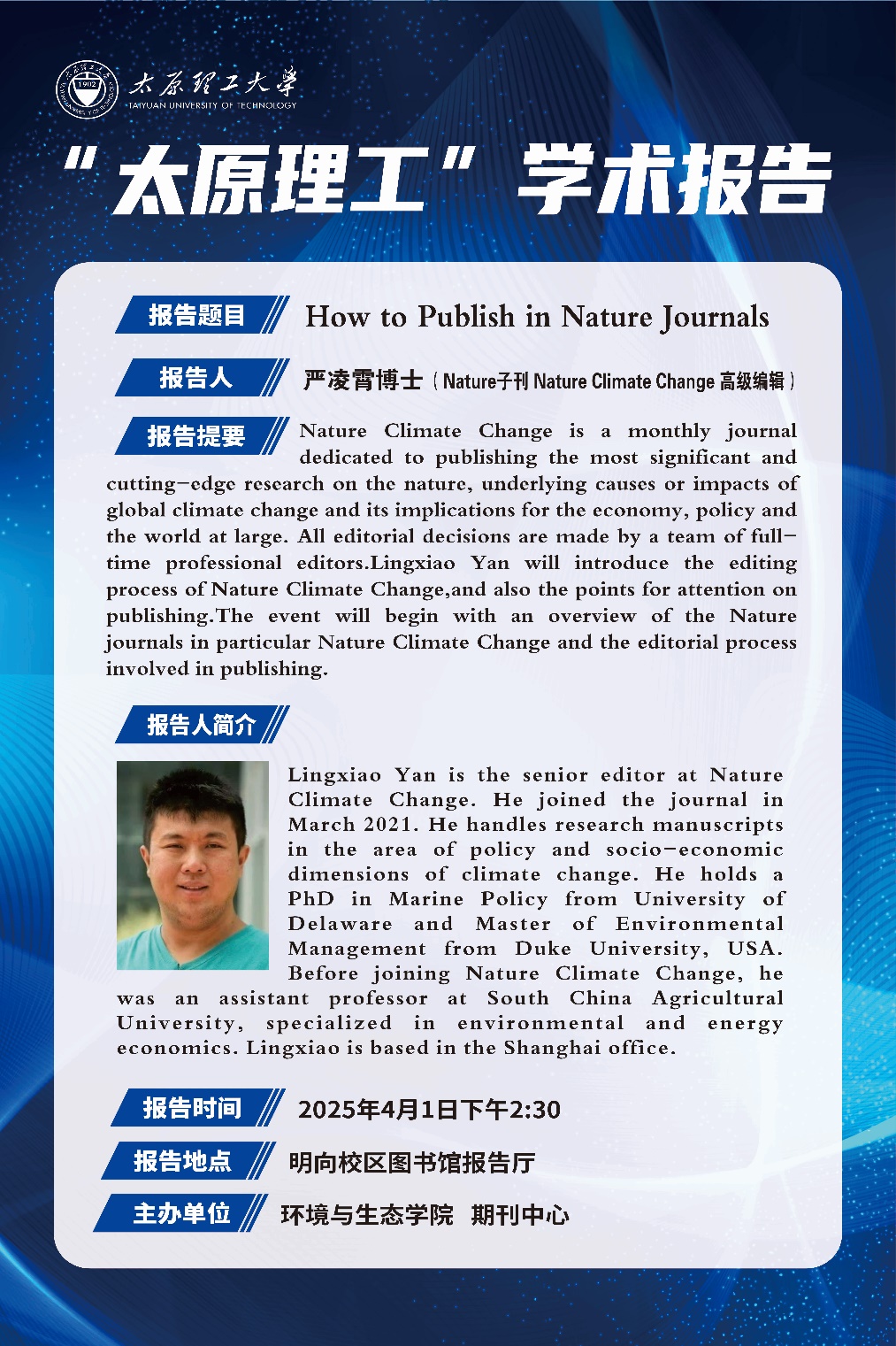 4月1日,公司将邀请Nature子刊《Nature Climate Change》高级编辑严凌霄博士来校作主题报告,现将活动情况预告如下,欢迎全校师生参加报告会。