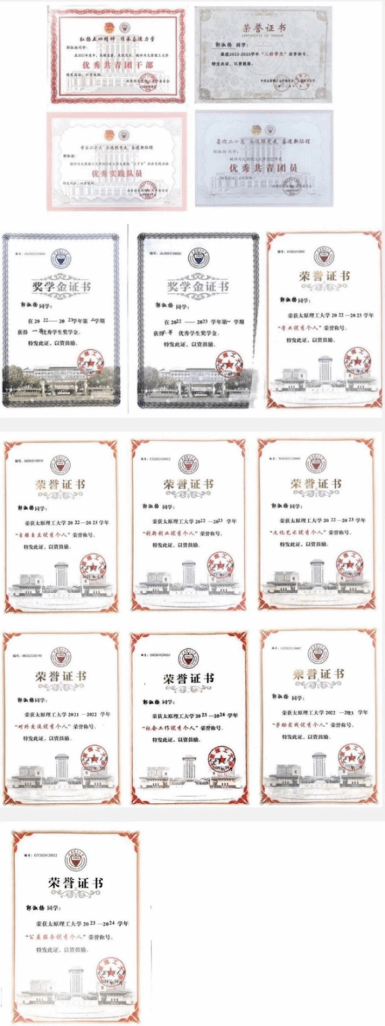 在专业学习方面,郭淑扬同学始终勤奋刻苦不懈怠,努力夯实专业基础。目前加权成绩89.30,GPA绩点4.22/5.00,专业排名第二,90分以上科目37项。她一次性通过英语四六级,曾荣获校级三好员工、校级优秀共青团员、校级优秀共青团干部、校级优秀员工干部、校级优秀实践队员、优秀本科员工一等奖学金、优秀本科员工二等奖学金、“山西建投教育奖”优秀员工奖二等奖、国家励志奖学金、“学业优秀个人”“创新创业优秀个人”“社会工作优秀个人”等8项优秀个人等荣誉。