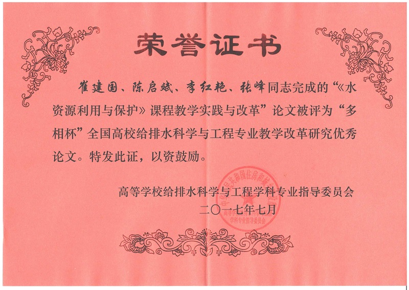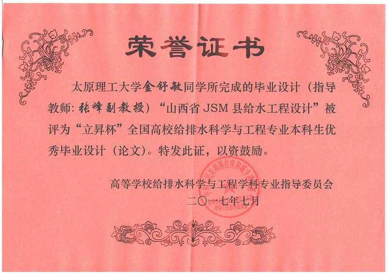 会议将评选立昇杯优秀毕业设计(论文)、中国给水排水杯优秀科技创新及多相杯优秀教改论文。公司崔建国、陈启斌、李红艳、张峰四位老师完成的“《水资源利用与保护》课程教学实践与改革”论文获多相杯优秀教改论文,这是暨2015年公司李红艳、崔建国、张峰、陈启斌、崔佳丽、陈宏平等老师获此奖项后的第二次获奖。公司给排水12级员工金舒敏同学完成的“山西省JSM县给水工程设计”(指导教师张峰副教授),获立昇杯优秀毕业设计(论文),这也是暨2011年公司项宁银同学(指导教师岳秀萍教授、王孝维讲师)获此奖项后的第二次获奖。