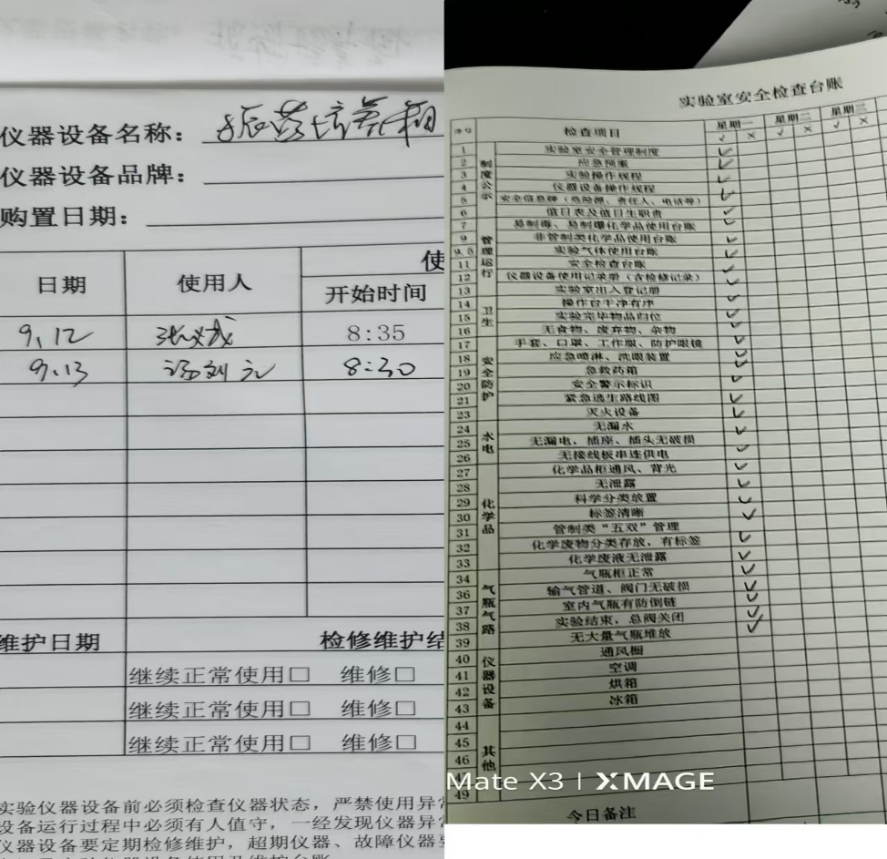 3.部分实验室台账记录不规范,如:化学品台账的入库日期,入库量,每个日期用多少最后剩多少要写全;实验室人员出入台账记录只有进没有出;实验仪器设备使用及维护台账填写超前等,应督促所有进入实验室人员记录完整。