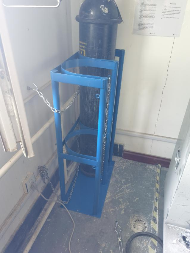 3、B224后实验室室内气体钢瓶无底座,存在安全隐患,气体钢瓶需合理固定,应采用加装底座和防倒链等措施。