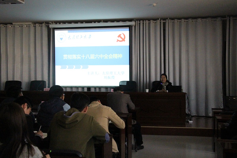 刘振霞副教授给党员师生做了题为《贯彻落实十八届六中全会精神》的专题辅导。她从高校承担的历史使命强调了学习贯彻十八届六中全会精神的重要性,指出学习贯彻全会精神是教师教研发展的需要,是党的事业发展的需要,是广大党员和公民的义务。刘教授以《人民的名义》切入主题,引经据典解读了十八届六中全会精神的重大意义和主要精神,并从理想信念的概念、重要性及怎样坚定理想信念等方面阐释了坚定理想信念的重要性。